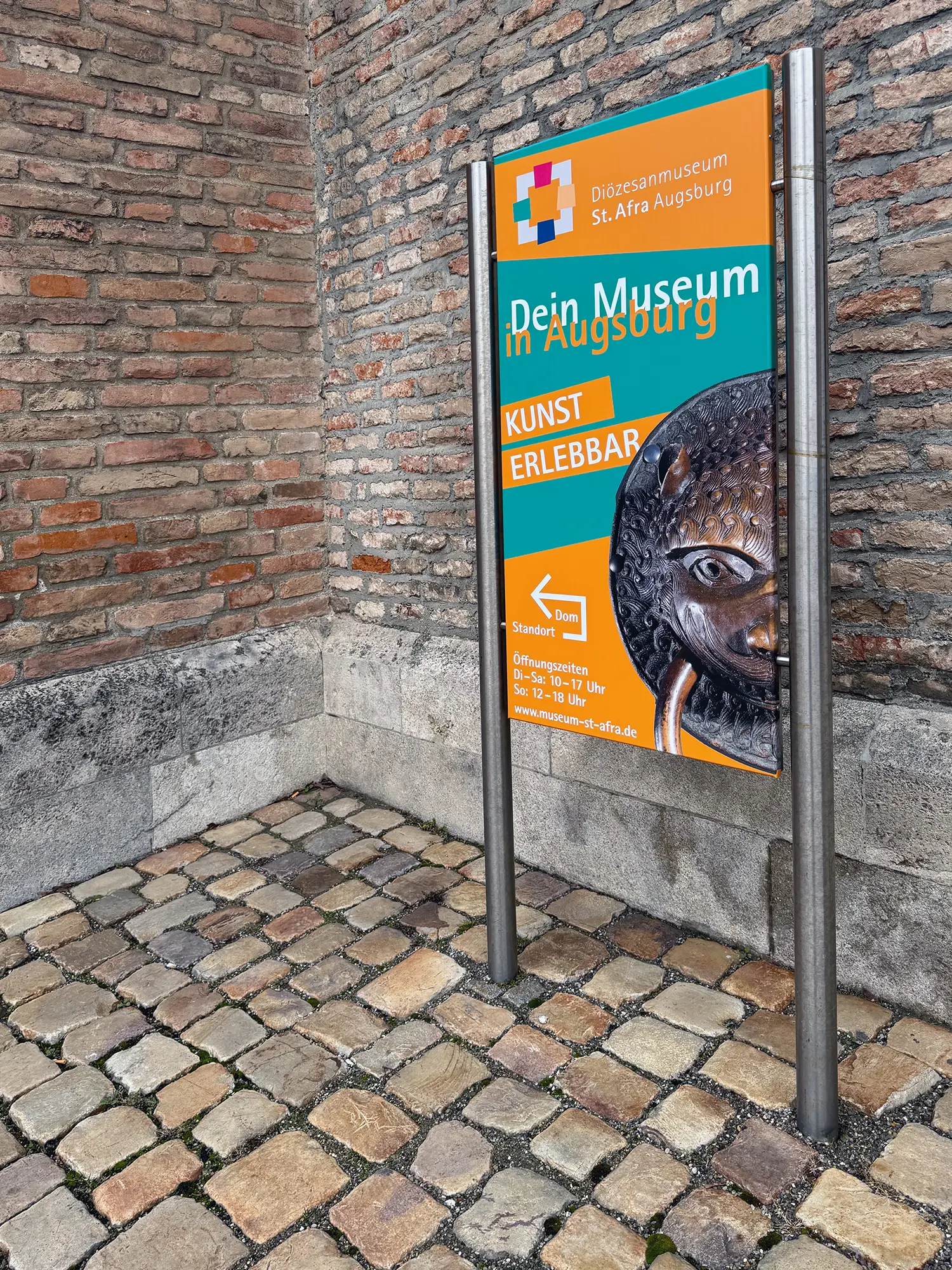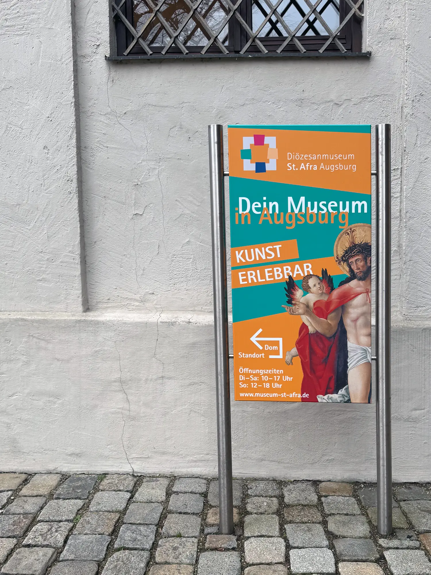 Gestaltung eines Beschilderungssystems für das Diözesanmuseum St. Afra. Verschiedene Tafeln in verschiedenen Größen an den einzelnen Wegpunkten und ein Informationsflyer auf Deutsch und auf Englisch.